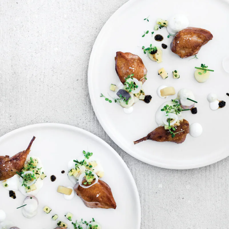 Répartir dans l’assiette: cuillerées de crème sure, de moutarde et de macédoine, points de mousse de pomme de terre, oignons marinés et pommes de terre grelots. Ajouter 2 cuisses et 2 suprêmes et garnir de ciboulette et de pousses de trèfle.