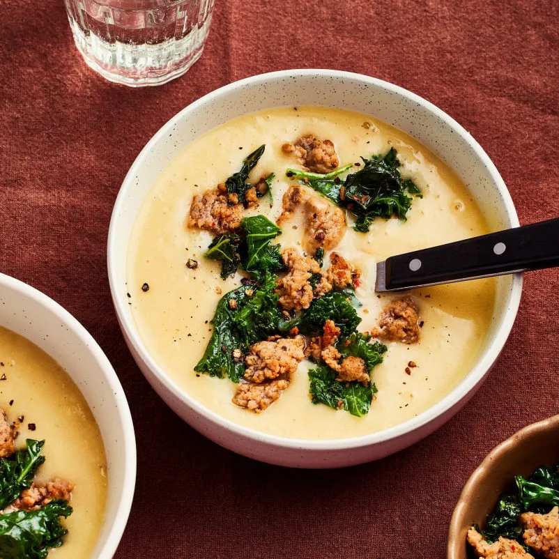 - Dans une poêle, à feu moyen-vif, faire revenir la chair à saucisses afin de bien la colorer. Incorporer le kale et laisser cuire pendant 1 à 2 minutes afin qu’il soit bien tendre.
