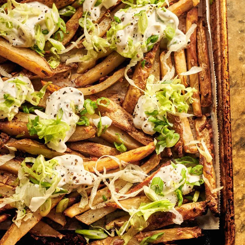 - Dans un petit bol, mélanger tous les ingrédients pour la sauce, puis garnir les frites avec la sauce et la laitue avant de servir.