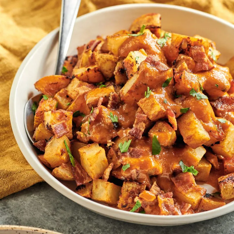 - Garnir les cubes de pommes de terre avec le reste de la sauce et le bacon émietté, puis servir.