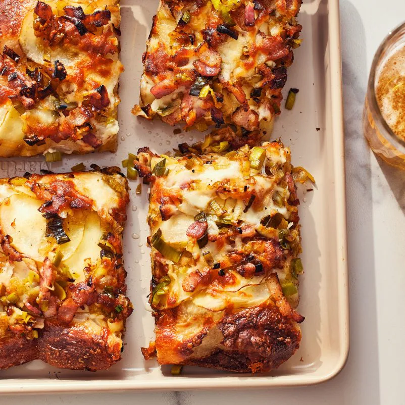 - Tapisser l’abaisse de la pâte à pizza de crème fraîche, ajouter les tranches de pommes de terre, puis le mélange de bacon et de poireau. Ajouter le fromage par-dessus.