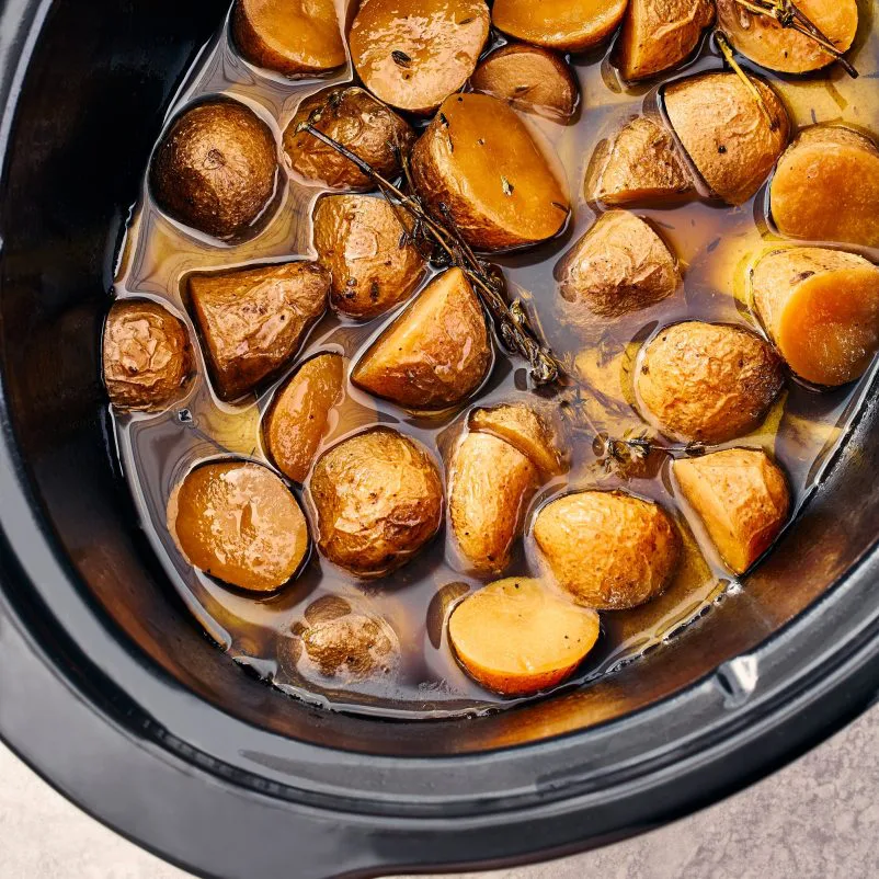 - Déposer les pommes de terre, l’huile, le bouillon, le sirop d’érable, l’ail et le thym dans la mijoteuse, puis assaisonner généreusement.