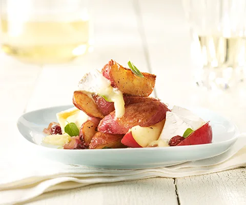 - Répartir le mélange de poire au fond de chaque assiette. Déposer les pommes de terre de façon à les placer un peu en hauteur et ajouter le fromage.