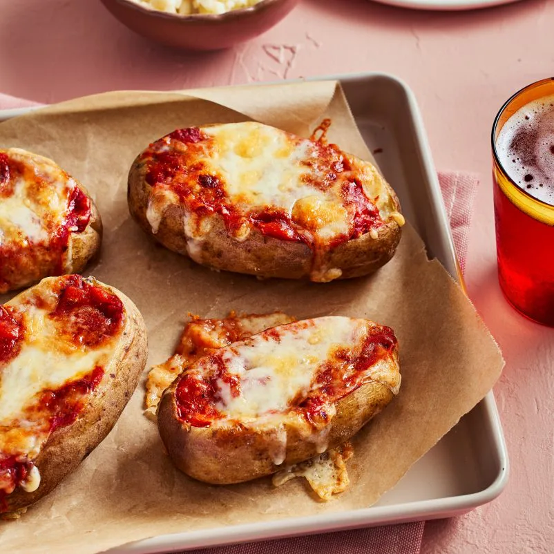 Remplir chaque pomme de terre avec environ ¼ de tasse de sauce à la viande, couvrir avec ¼ de tasse de fromage râpé et puis saupoudrer de parmesan.