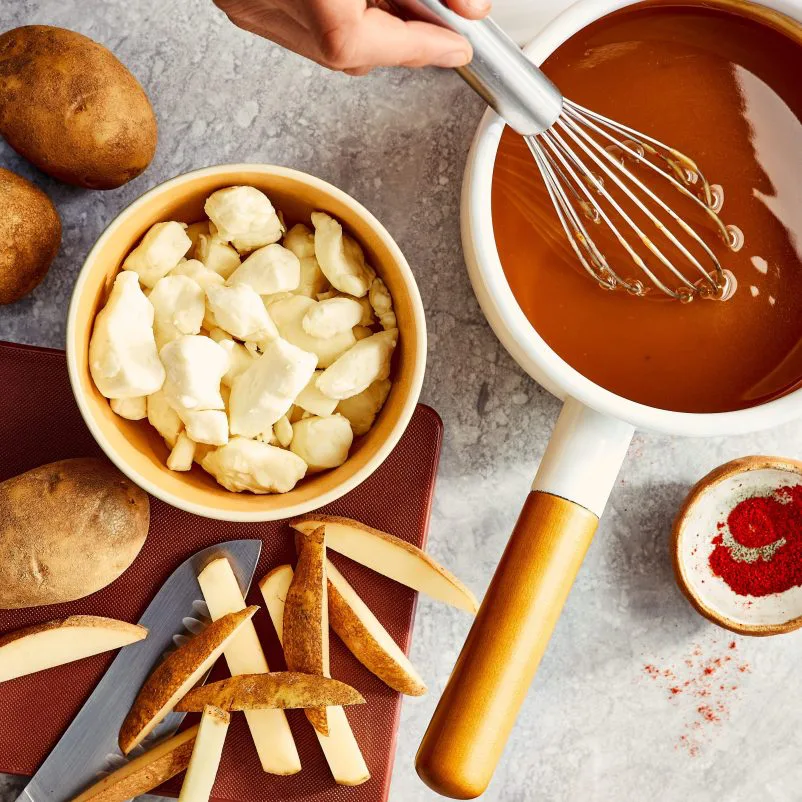 Mettre dans une assiette les frites, les parsemer de fromage « skouik-skouik » et napper d’un peu de sauce.