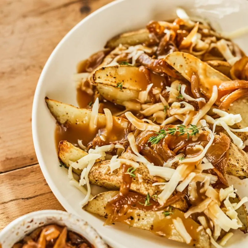 Garnir les pommes de terre avec les oignons caramélisés, saupoudrer le fromage et arroser de sauce pour servir.