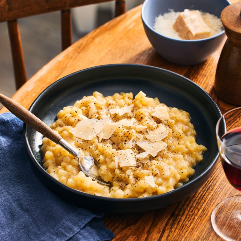 - Hors du feu, ajouter le parmesan, le beurre et le poivre. Bien mélanger jusqu’à ce que le beurre soit fondu et que la texture soit très crémeuse. Rectifier l’assaisonnement.