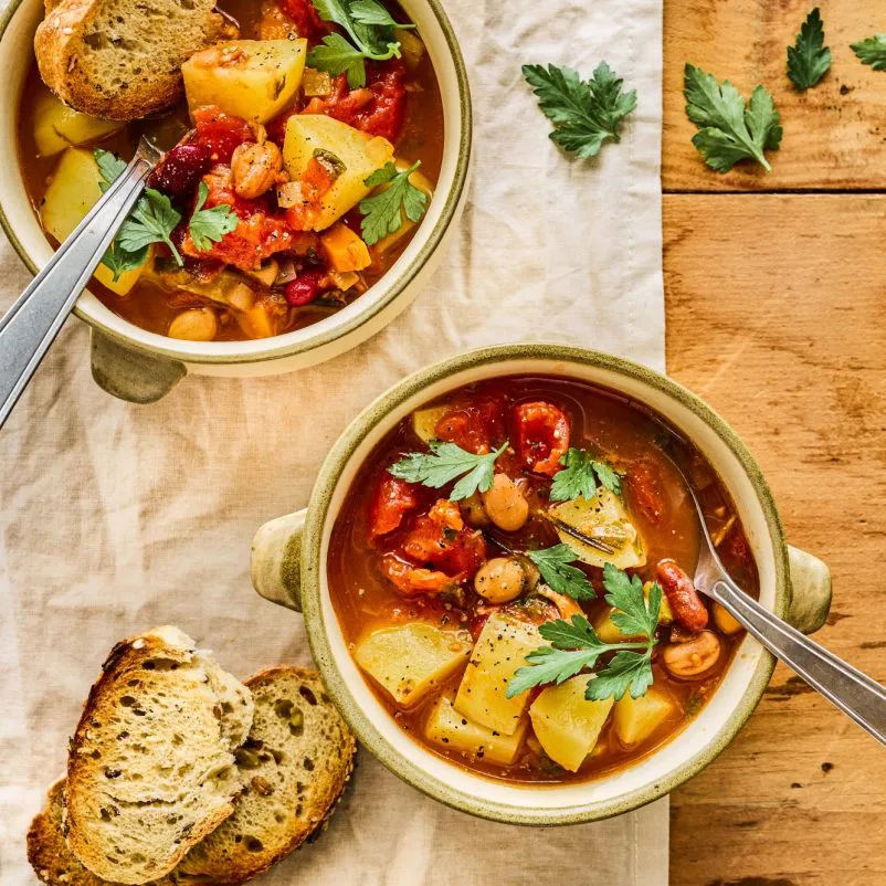 Ajouter les épinards, les haricots, le bouillon de bœuf et la croûte de parmesan, puis laisser mijoter environ 15 minutes, ou jusqu’à ce que les pommes de terre soient cuites.