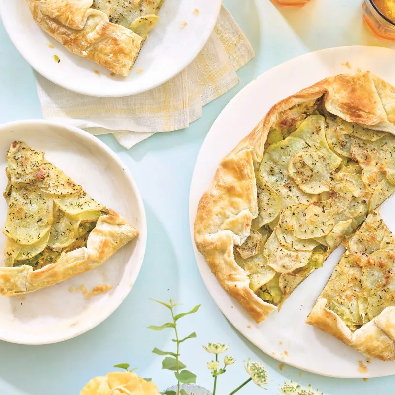 - Sur une surface légèrement farinée, abaisser légèrement la feuille de pâte feuilletée. La déposer sur la plaque, puis la piquer à l’aide d’une fourchette. Badigeonner de la moutarde de Dijon, en laissant un rebord de 1 po (2,5 cm). Étendre le mascarpone sur la moutarde. Répartir le mélange de poireaux sur le dessus, puis étaler joliment les tranches de pommes de terre du Québec. Parsemer du fromage fermier et du romarin, puis saler et poivrer. Délicatement, replier le rebord de la tarte paysanne vers l’intérieur. Badigeonner le rebord de l’œuf battu.
